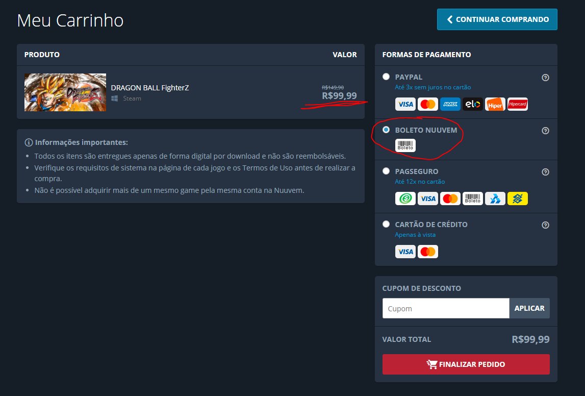 Obs.: Importante notar que os jogos acima com preços menores que os da loja são apenas para compras efetuadas pelo Boleto Nuuvem. Não sabe onde fica? Não tem problema! Na confirmação do pagamento de seu carrinho de compras basta selecionar essa opção aqui: